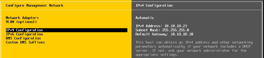 Lo que nos puede pasar en este punto es que no tengamos el enlace, ya que por defecto la configuración IP del ESXi está por DHCP. Nuestro objetivo es asignar una IP estática para que nunca se pierda y así también poder acceder desde cualquier punto de la red. Por lo tanto, basta con pulsar la tecla F2, nos saldrá un pop-up de autentificación con el usuario root y tendremos que introducir la contraseña que previamente hemos dado. Una vez hecho esto, pasamos a esta pantalla: