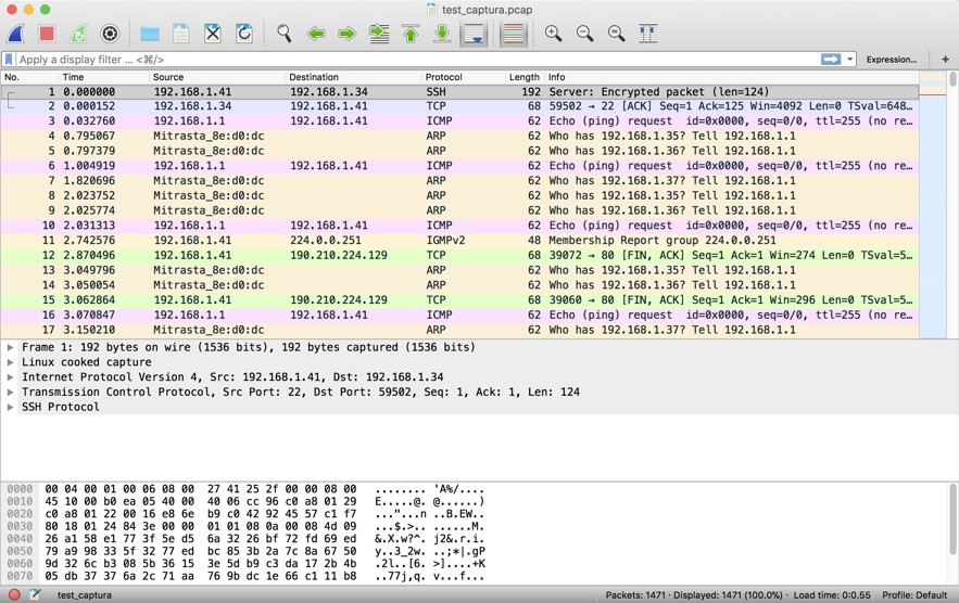 Una vez realizada la captura, la importamos con Wireshak. File/Open y seleccionamos “test_captura.pcap”